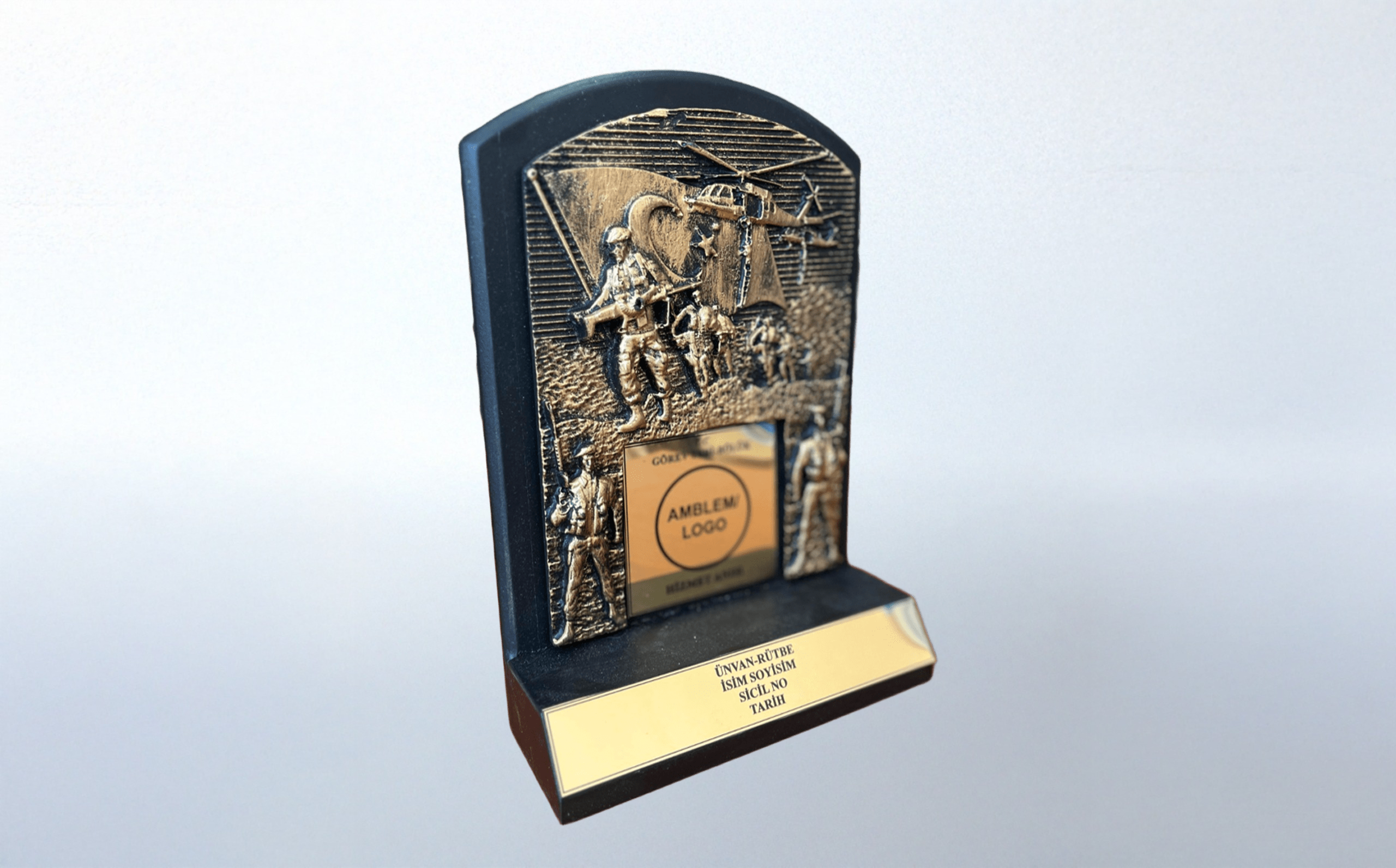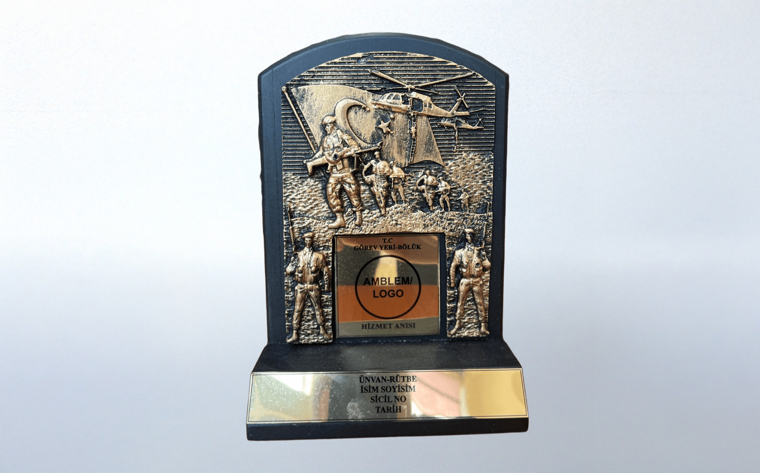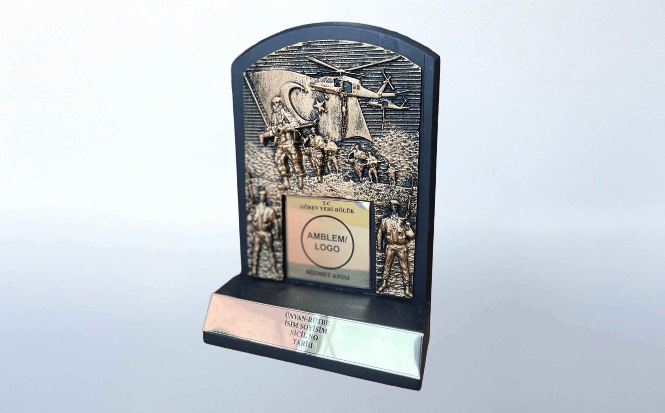 Askeri birlik plaketi, görev süresi boyunca fedakârca hizmet eden personel için özel olarak tasarlanmış, anlamlı ve estetik bir hatıra ürünüdür. Siyah tahta zemin üzerine uygulanan mermer ve kemik tozu karışımı özel malzeme, eskitme gold renkle zenginleştirilmiş ve ürüne geleneksel ama güçlü bir görünüm kazandırmıştır.